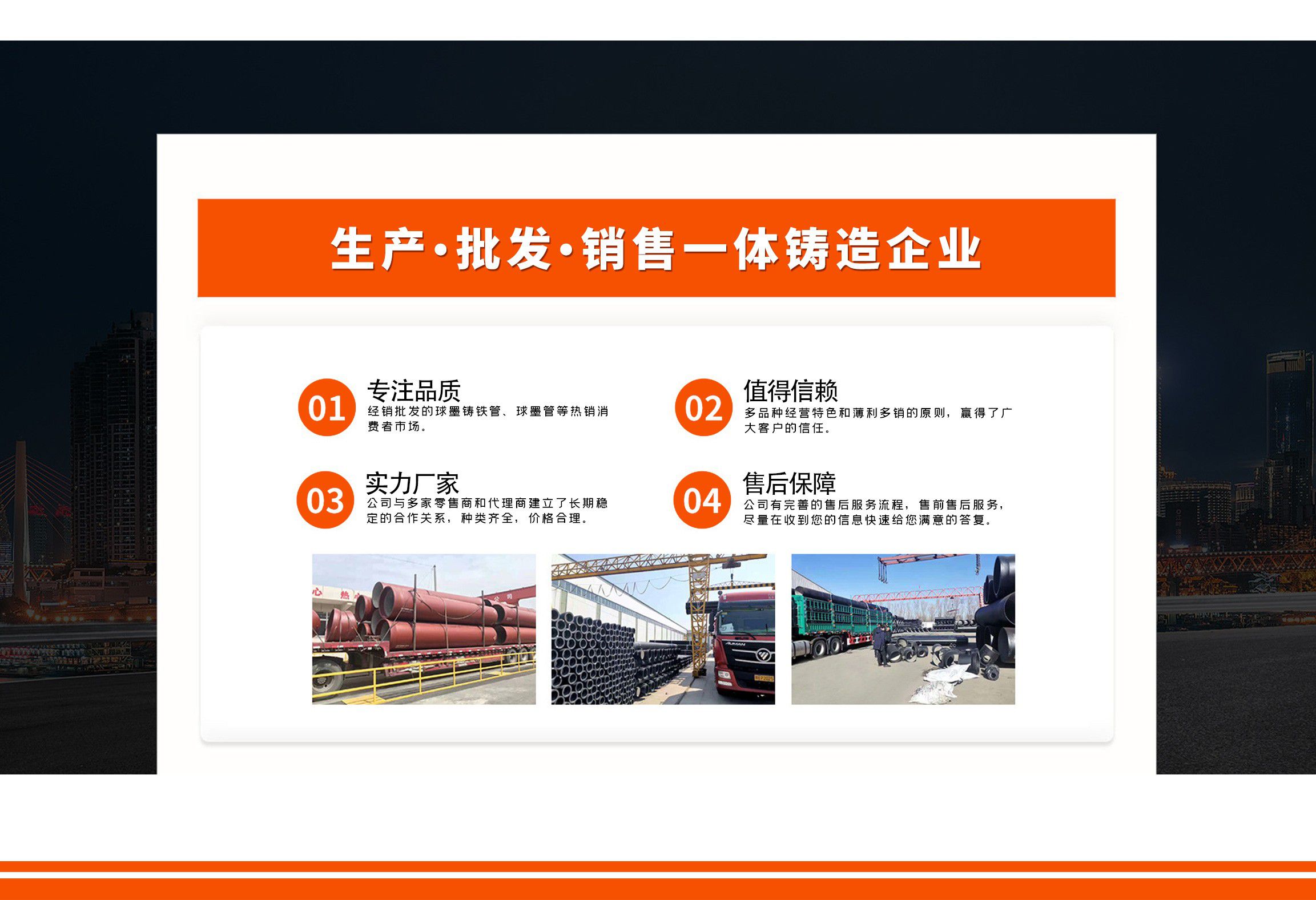 青島金源達管業(yè)有限公司主要經(jīng)營各種規(guī)格球墨鑄鐵管,球墨管,球墨鑄鐵管廠家等產(chǎn)品,質(zhì)量可靠,誠信經(jīng)營,值得信賴! 青島金源達管業(yè)有限公司始終堅持“誠信立業(yè),追求卓越,合作共贏,共同發(fā)展”,竭誠歡迎各界朋友來廠參觀指導(dǎo),洽談業(yè)務(wù)。我們愿與您攜手共進,互惠雙贏,共創(chuàng)未來! 公司堅持“以奮斗者為本”的理念,關(guān)心關(guān)愛職工,職工的獲得感、幸福感更加充實、更有保障、更可持續(xù);秉承“忠誠企業(yè)、勇于擔(dān)當(dāng)、開拓創(chuàng)新、主動作為”,堅持黨建領(lǐng)航、創(chuàng)新驅(qū)動、文化塑魂、奉獻社會,全面致力于綠色、低碳、高效、高質(zhì)量發(fā)展。 愿與各界朋友攜手并進,共創(chuàng)未來!...